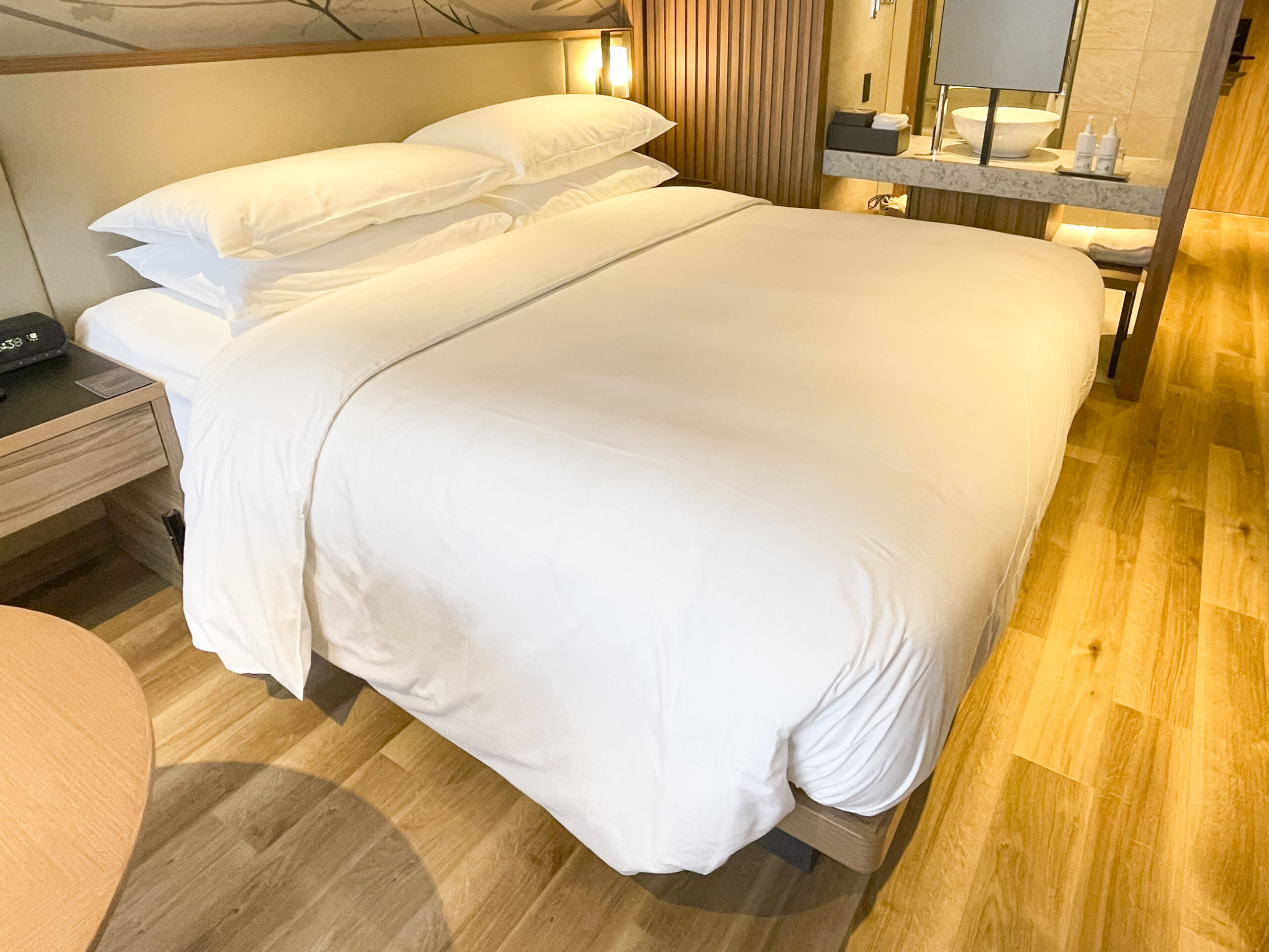 ベッドはキングサイズで高さもあり、なんといっても程よい硬さのあるマットレスと寝心地抜群のシーツでした。