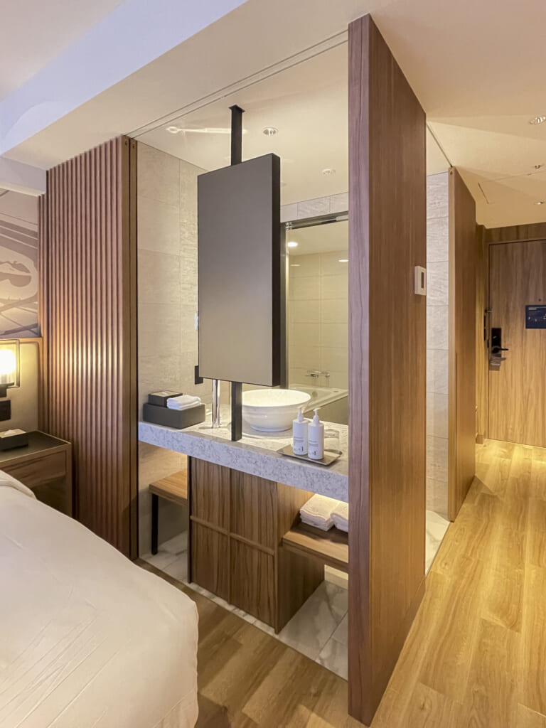 洗面台とベッドルームの間仕切りは移動する仕組みになっていました。