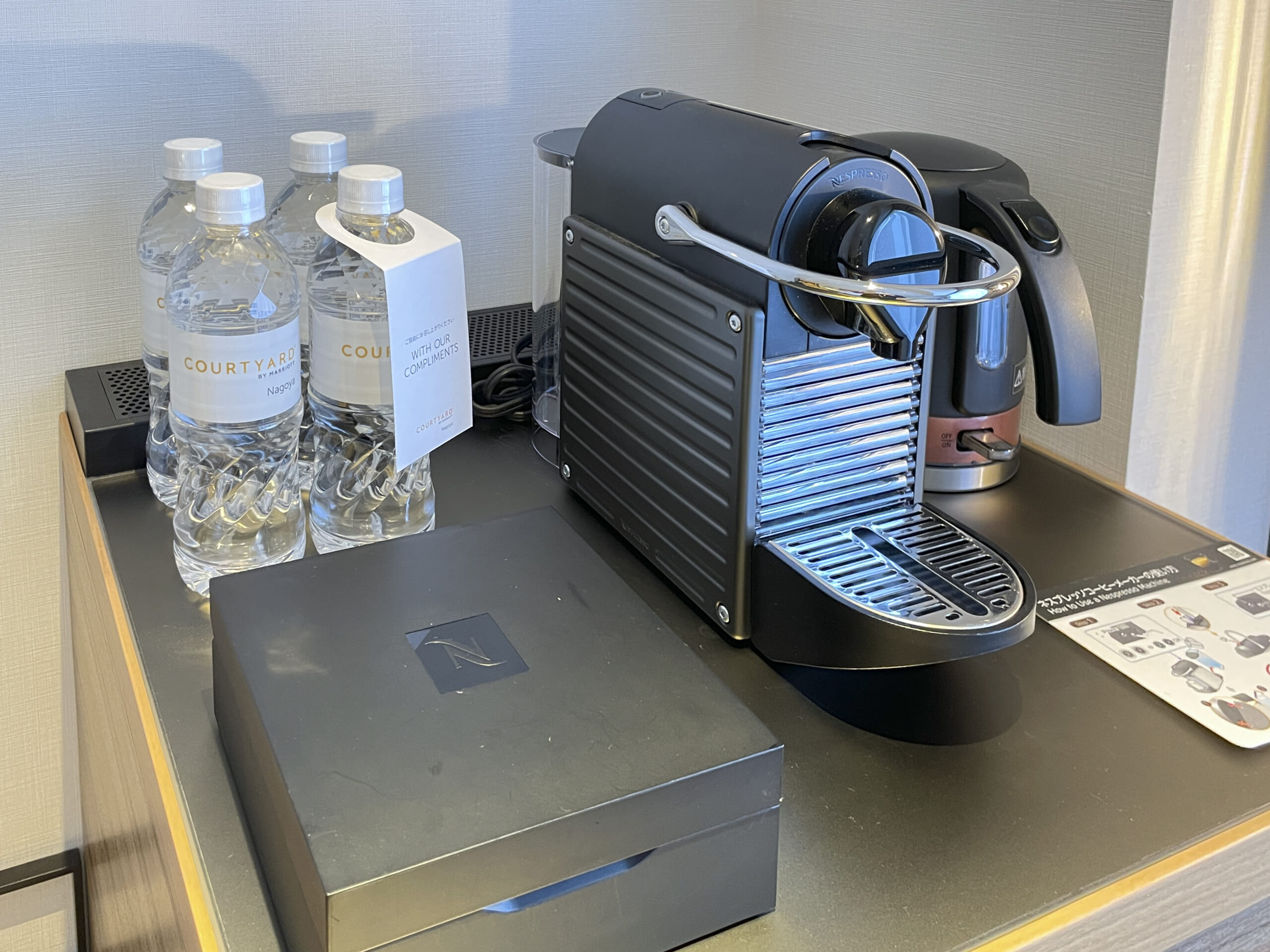 無料のミネラルウォーターが4本(2人分)とネスプレッソのコーヒーマシーン、ポットがあります。