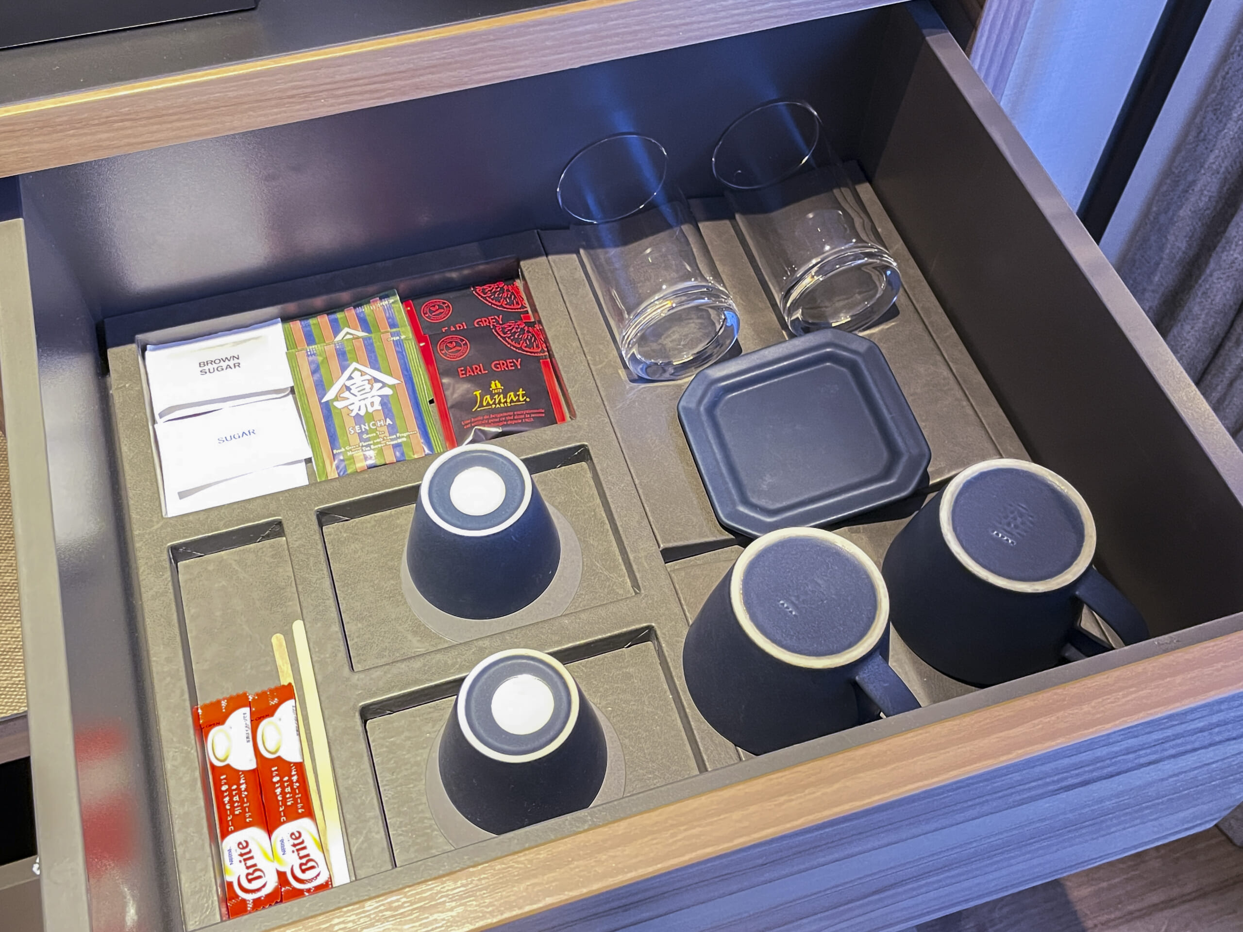 引き出しにはエスプレッソ用カップ、レギュラー用カップ、グラスお茶や紅茶が並んでいます。