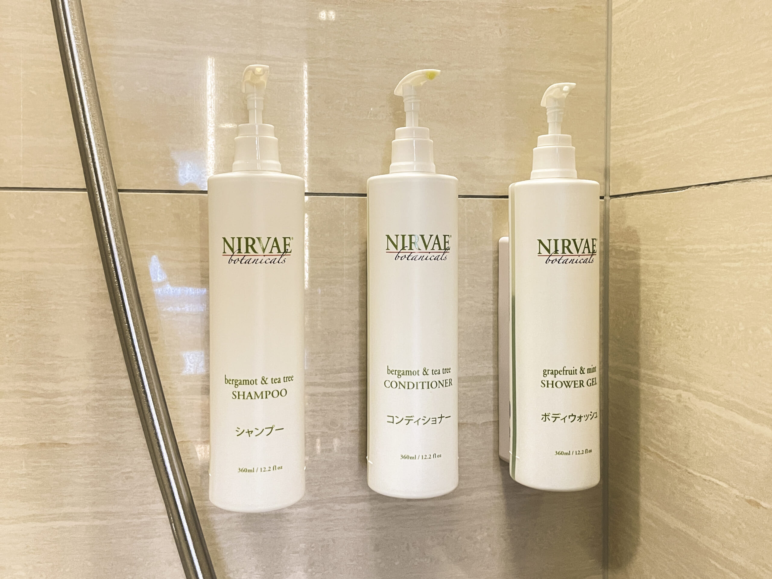 壁に据え付けられた「NIRVAE(ニルヴァエ)」のアメニティ、タイのブランドで柑橘系の甘い香りでした。