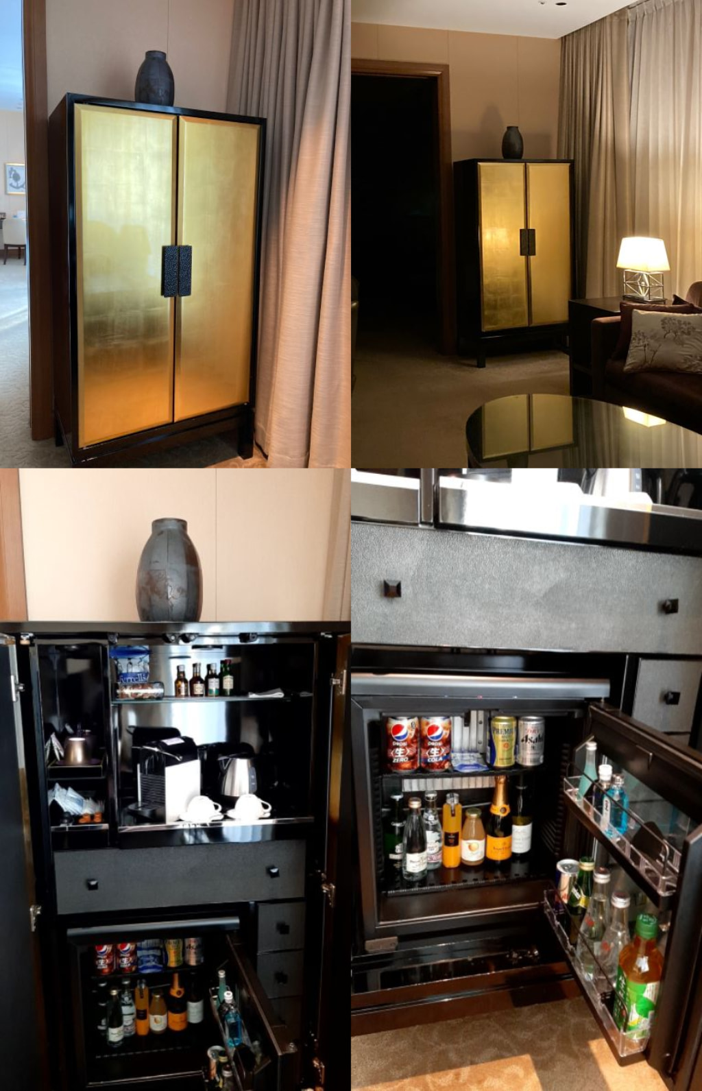 金色の物体の中はミニバーと冷蔵庫でした。