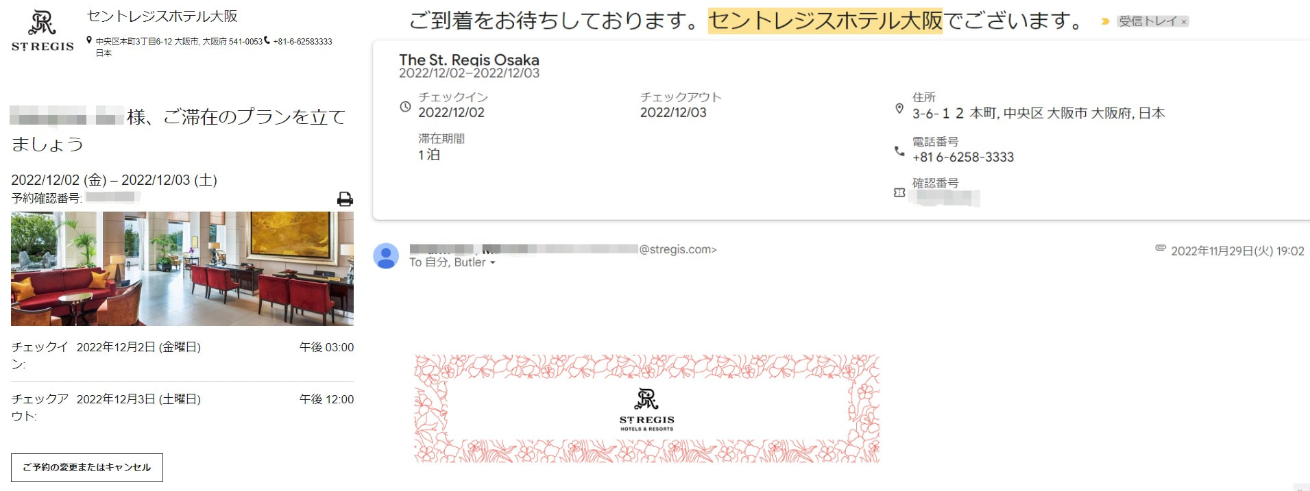11月27日(日)に「ご滞在のプランを立てましょう」というメールが届き、11月29日(火)には「ご到着をお待ちしております。セントレジスホテル大阪でございます。」というメールも届きました。