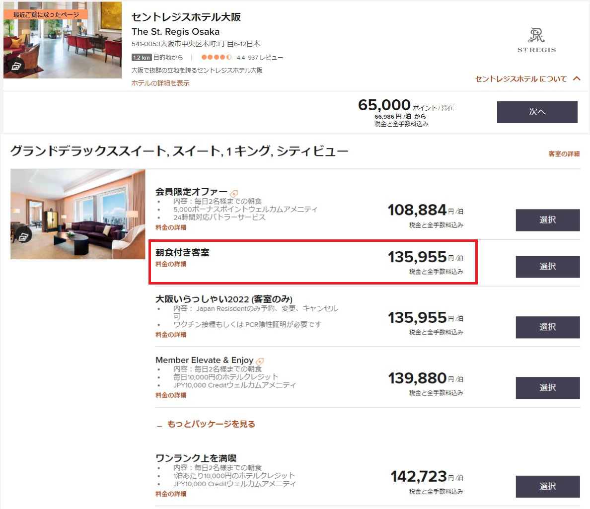50,000ポイントではなかなかセントレジスホテル大阪のような高級ホテルには宿泊できません。