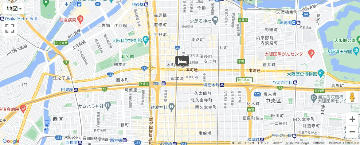 「本町駅」へは「梅田駅」から大阪メトロ御堂筋、または「西梅田駅」から大阪メトロ四ツ橋線に乗ります。「本町駅」までいずれも2駅3~4分で運賃は180円です。ちなみにホテル専用の送迎バスはありません。